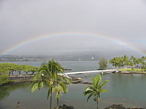 I got up 9 o'clock and it was cloudy. I felt very comfortable and it was not hot even no air conditioned. I could see the rainbow over the Hilo bay.