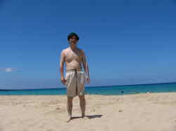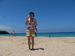 When we arrived at Hapuna beach, it was 10:30 am. The weather was fine and temperature was high. We thought we would have suntan, so we used UV cut oil. The beach is very clean and wide. At the end of the beach, there was Hapuna Prince Hotel. I used a snorkel which we bought in Japan for this trip. It was easy to breeze. This beach is very good beach, but there was no fish. When we stayed in the beach, it was too hot. We swam there for about two hours. Near the beach, there was a hamburger stand and we bought a jumbo size cup of cola and vegetarian burger. After that, we dropped in Waikoa shopping center and Mariot Hotel which were built recently.